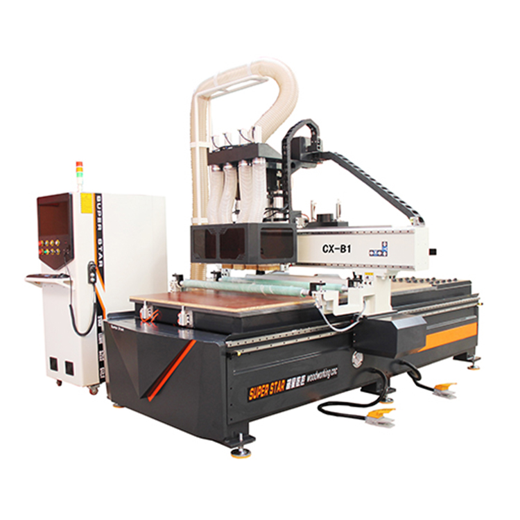 多工序木工雕刻機(jī)擁有多個(gè)機(jī)頭,如:三工序木工雕刻機(jī)就有三個(gè)機(jī)頭,三個(gè)機(jī)頭上安裝不同類型的刀具,當(dāng)需要換刀時(shí),當(dāng)前的機(jī)頭上去,需要的機(jī)頭下來繼續(xù)雕刻。木工加工中心是僅有一個(gè)機(jī)頭,但是他擁有一個(gè)刀庫,不同機(jī)型有不同的刀庫容量,有8把、12把等,根據(jù)刀庫的形狀和換刀方式有盤式換刀、斗笠式換刀、排式換刀等,換刀時(shí),機(jī)頭移動(dòng)至刀庫,選擇好需要的刀具,回來繼續(xù)雕刻。